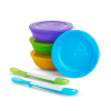 A Munchkin Love-a-Bowlstálka-fedélpárosítás100%-ban szivárgásmentesek, így ideális társak a baba etetéséhez, nem csak otthon, hanem egy kirándulás vagy utazás során is. Ez a négy tálkából fedélbõl, valamint két puha hegyû kanálból álló készlet ideál