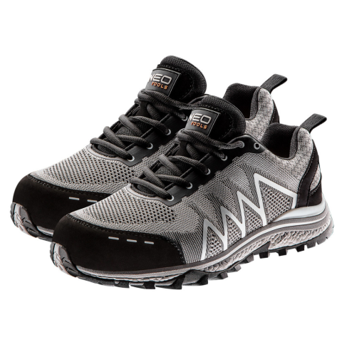 NEO Munkavédelmi cipő. A felsőrész lélegző anyagból készül. A gumival bevont, EVA habból készülő csúszásgátló talp kimagaslóan komfortos és hatékonyan csillapítja a rázkódást, garantálva a biztonságot és a kényelmet. A cipő belső részének puha kialakítása kényelmes viseletet biztosít. Munkavédelmi cipő O1, fém betét mentes, méret: 46, szövetanyag felsőrész, hálós belső kivitelezés, a cipőtalp gumiból és EVA habból fröccs öntve, könnyű, lél