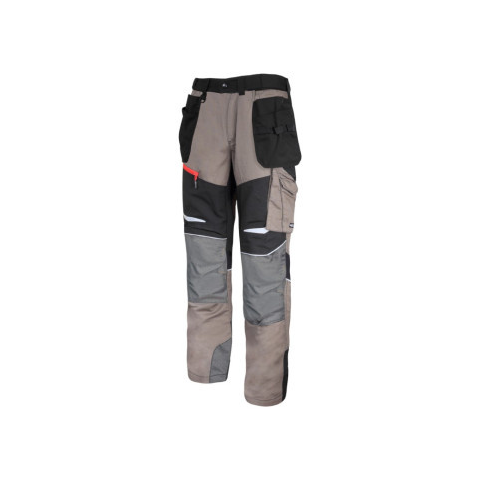 • Anyaga: 35% pamut, 65% poliészter • 13 darab zseb, melyből 1 cipzárral zárható. Speciális anyagból készült zseb mobiltelefonnak, mely elnyeli az elektromágneses sugárzást. Zseb térdvédőnek. 4 irányban elasztikus toldások, melyek kényelmesebbé teszik a viseletet. Légáteresztő toldások a térdhajlatban. Fényvisszaverő csíkokkal ellátva, amelyek nagyobb láthatóságot biztosítanak munka közben. Megerősített tripla varrások. Állítható övrész. Csúszásgát
