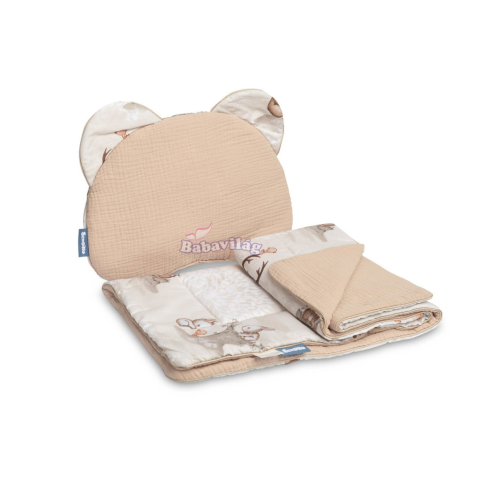 A készlet egy takaróból/paplanból és egy TEDDY párnából áll. A muszlin szett rendkívül kellemes, puha és finom a baba bőrének, így élete első napjaitól kezdve tökéletes. A készlet egy párnát és egy kellemes tapintású muszlinból és pamutból készült takaró