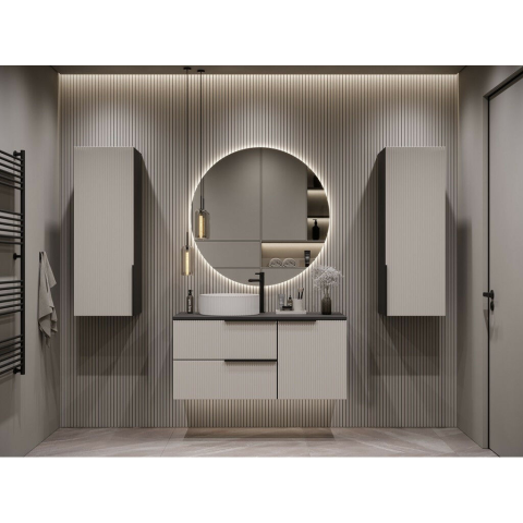 Mylife Klerk 100 Fürdőszobabútor Szett - Antracit/Kasmír ✨ Ez a stílusos Mylife Klerk 100 fürdőszobabútor szett tökéletes választás modern fürdőszobájába. A szett antracit színű vázzal és kasmír színű, hornyolt MDF frontokkal rendelkezik, vízálló mun...
