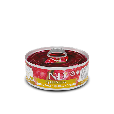 Minimum vásárolható : 3db N&D Quinoa Skin&Coat Fürj egy teljes értékű, gabonamentes egészséges szőrzetet és bőrt támogató nedves eledel felnőtt macskák számára. Fürj, quinoa, kókusz és kurkuma, lenmag, körömvirág, útifű hozzáadásával fejlesztették ki .