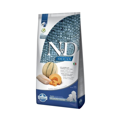N&D Ocean Dog tőkehal,sütőtök & sárgadinnye Puppy medium/maxi 12kg kutyaeledel termékleírás