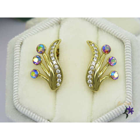 Antiallergén egyedi kidolgozású fülbevaló.Oldalra hajló virág fiurmályú Swarovski köves fülbevalóSzin: 14K Méret: 18x10mm Zár: francia kapocs
