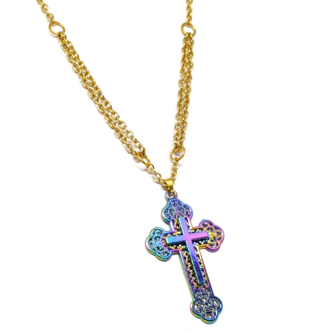1 kép Nagy eloxált díszes kereszt medál arany színű kétsoros nyaklánccal