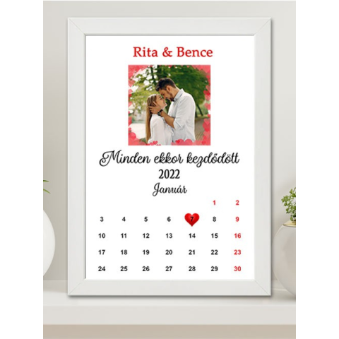 Nagy falikép évfordulóra, minden ekkor kezdődött. Falikép saját fotóval és naptárral, ami szerelmetek kezdetét jelzi. Tökéletes meglepetés akár házassági évfordulóra, de valentin napra is. A képkeret és a háttér színe fehér, falra akasztható, képkeret mér