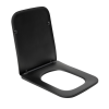 Fekete színű, szögletes kialakítású WC-ülőke lassan összecsukható és könnyen eltávolítható funkcióval.