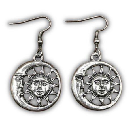 Antik ezüst színű Nap és Hold fülbevaló, amely az égi harmóniát szimbolizálja. Elegáns, beakasztós kialakítás, 2,5 cm átmérőjű medállal