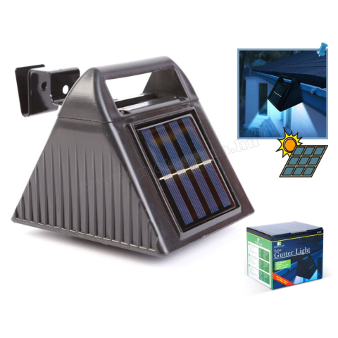 Különleges kialakítású és felfogatású, energiatakarékos szolárlámpa, Ereszcsatorna fény. Falra, ereszcsatornára, kerítésre, balkonra is rögzíthető. Nappal a napsütésnek köszönhetően a beépített akkumulátor feltöltődik, este pedig automatikusan bekapcsol a