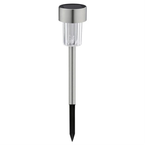 Leszúrható napelemes kerti lámpa Anyaga rozsdamentes acél/műanyag 1x LED (DIP) hideg fehér 0,08W / 2V amorf napelem Ni-Mh akkumulátor AAA 1,2 V / 200 mAh Aljzat: állandóan beépített LED Világítási idő 8 óra Hidegfehér fény 7500K IP44 Méretek (ø x h): 62 x