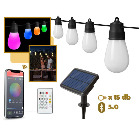 Napelemes, energiatakarékos, hagyományos villanykörte izzós fényfüzér színes LED-ekkel. A tartozék távirányítóval vagy okostelefonra letölthető, ingyenes applikációval vezérelve többféle előre beállított hangulat és fényprogram közül választhat, akár mind