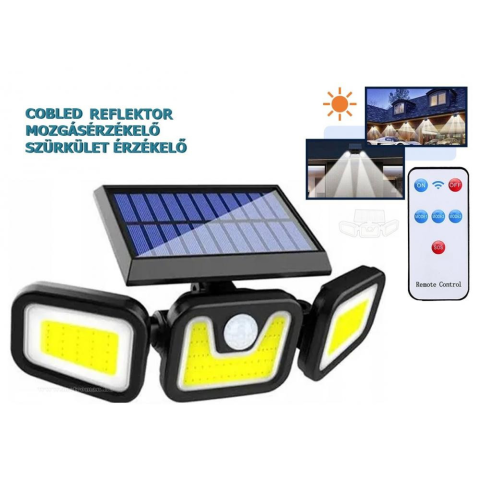 - Praktikus napelemmel egybeépített kültéri COB LED lámpa sötétedés és mozgásérzékelővel. - Nem igényel vezetékelést, könnyen és gyorsan telepíthető. - Napelempanel a lámpatesttel egybeépítve. - 3 különálló extra fényerejű COB LED lámpa, melynek dőlésszög