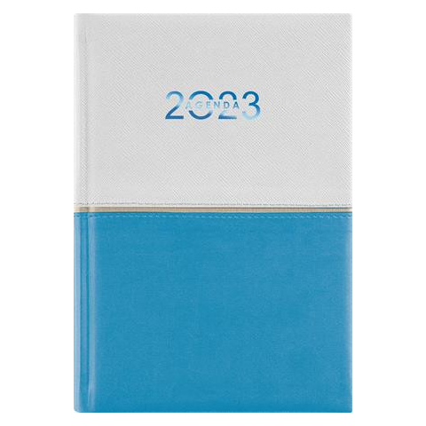 Naptár, tervező, A5, napi, DAYLINER Contrast, fehér-világoskék Puha bőrhatású anyagból. A színek egy alkotnak derűs összhangot. -időbeosztás: félórás, 8-18.00 h -műbőr, bőrhatású borító -lapok 70 g/m2, fehér ofszet papírból -jelzőszalaggal -sarokperfo