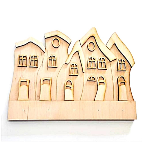 1 kép Natúr fa dűlöngélő házsor kulcstartó alap. Mérete: 205x155x5+5 mm