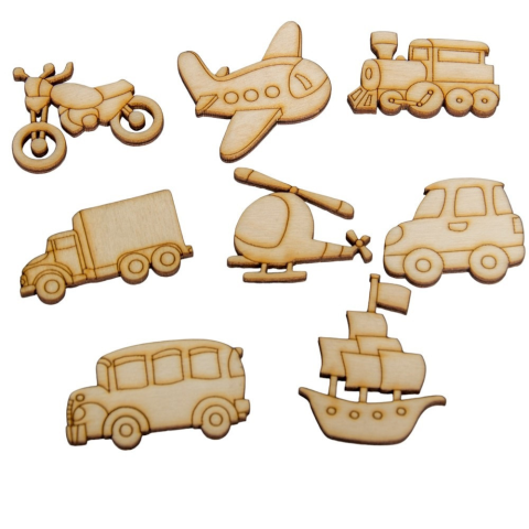 Aranyos, természetes hatású natúr fa járművek különböző formákban. Ideális választás gyerekeknek, kreatív alkotóknak és kézműves projektekhez. A natúr fa járművek 3–4 cm-es 8 db-os szett kiváló alapanyag minden kézműves tevékenységhez. A készlet különf