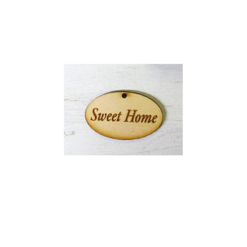 1 kép Natúr fa ovális tábla 'Sweet home' felirattal. Mérete: 40x25 mm