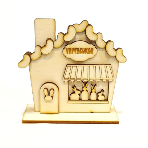 Natúr fa vattacukor-bolt, nyuszi eladókkal. Talpba állítható, de lehetőség van 3 vagy 5 részes talpat is vásárolni hozzá, különleges, vidám húsvéti falut készítve belőlük. Lapraszerelten szállítjuk.