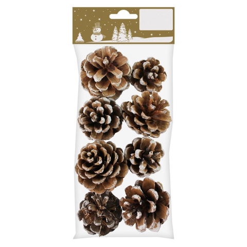 1 kép Natúr fenyőtoboz fehér csúcsokkal és akasztódróttal 8 darab kb. 5 cm