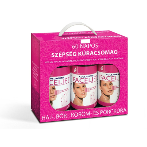 A 60 napos szépség kúracsomag, 3 palack szabadalommal védett, folyékony és kiváló felszívódású halkollagént, tengeri elasztint és növényi kivonatokat tartalmazó koncentrátumot tartalmaz. A Natur Tanya® Facelift kollagén mátrix előemésztett hal kollagén ö