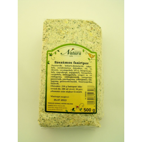 Összetevők: étkezési keményítő, zabpehely, zsemlemorzsa, (búzaliszt, víz, só, élesztő) szezámpehely, (8 %) burgonyapehely, napraforgó, árpa, -búza, -rozs, -és lenmagpehely, fűszerpaprika, NATURA ételízesítő, mely nem tartalmaz ízfokozót (nátrium-glutamát)
