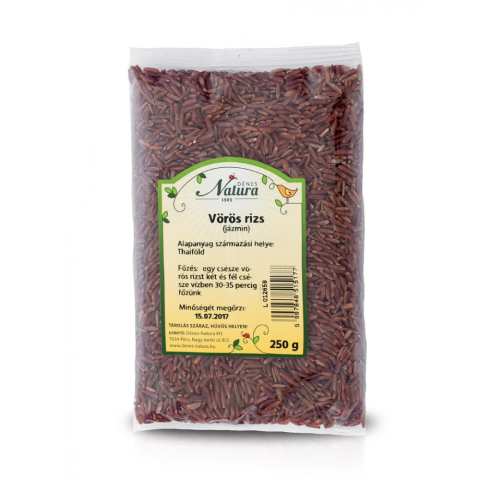 NATURA VÖRÖS RIZS 250 G: Egyedisége elsősorban sötétvörös színében mutatkozik meg. E hosszúkás, vörös színű rizsszemek nemcsak a külső tulajdonságaikkal, hanem a finom és egyedi ízükkel is változatosságot hozhatnak a köretekhez és a rizs-alapú ételekhez.