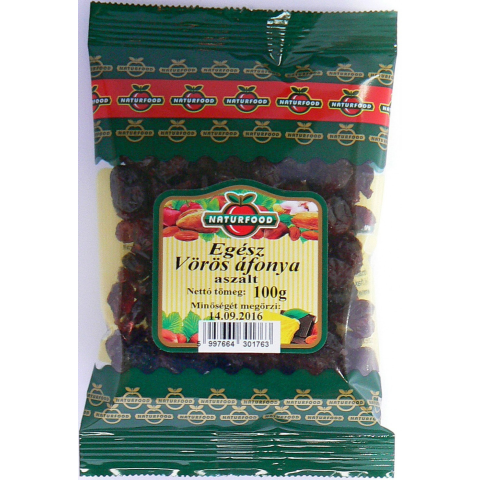 Naturfood Aszalt egész vörösáfonya 100 g – enyhén édes-savanykás, lédús bogyók természetes antioxidáns vitaminokkal, mangánnal, rézzel és rostokkal. Tökéletes müzlibe, joghurthoz, sütikhez vagy snackként.