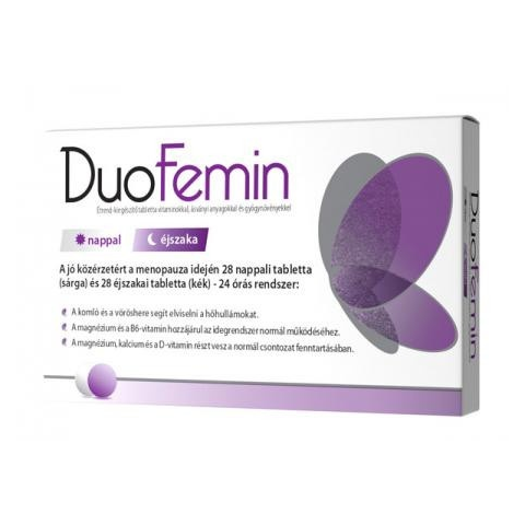 A DuoFemin Étrend-kiegészítő tabletta vitaminokkal, ásványi anyagokkal és gyógynövényekkel hozzájárul a jó közérzet fenntartásához menopauza idején. 28 nappali tabletta (sárga) és 28 éjszakai tabletta (kék) – 24 órás rendszer.