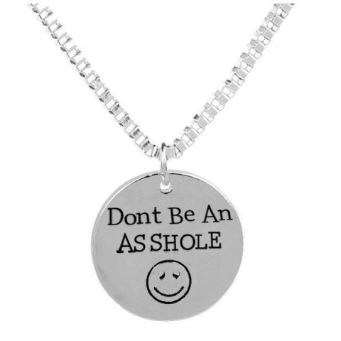 Ezüst színű, vicces nyaklánc "Ne légy seggfej" felirattal. Egyedi ajándék humoros üzenettel azoknak, akik szeretik a szokatlan kiegészítőket