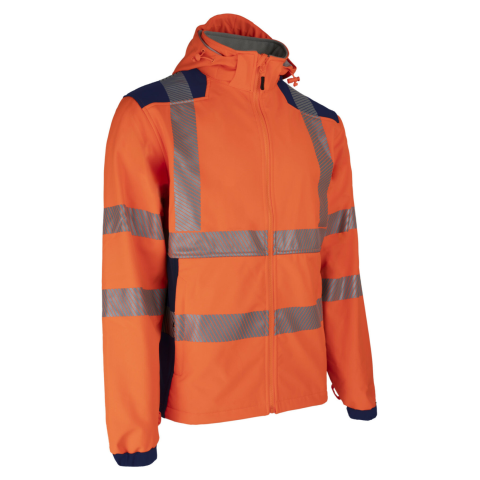 NEBULO FLUO NARANCS/SÖTÉTKÉK SOFTSHELL KABÁT_2XL * 295 g/m2 vastag 3 rétegű Softshell alapanyag GRS: 100% mechanikus stretch poliészter újrahasznosított + TPU membrán + 100% polár újrahasznosított * 5 cm széles fényvisszaverő csík: 2 a test körül, 2