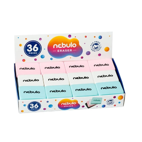 A termék ára egy darabra értendő, a képen a 36 darabos egységcsomag látható! Logózott minőségi radír 3 színben. PVC mentes, nem tartalmaz egészségre káros anyagot. Színek: kék, fehér, rózsaszín.