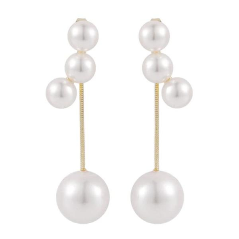 Exkluzív négygolyós gyöngy fülbevaló arany és gyöngyház színekben. Elegáns, hosszított dizájn minden alkalomra