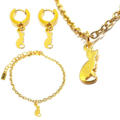 1 kép Nemesacél Cicás medálos nyaklánc, karkötő és fülbevaló szett, arany színű - dobozban
