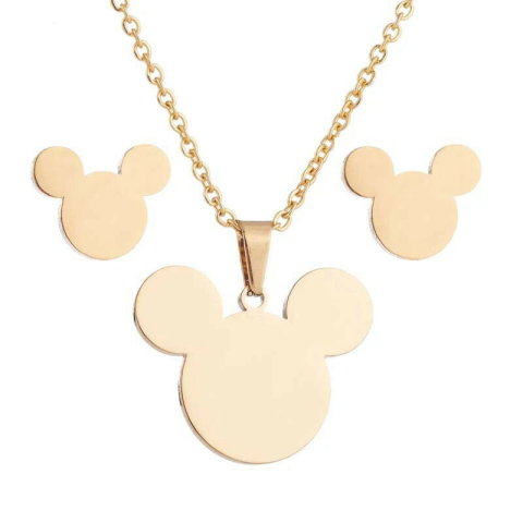 Nemesacél egeres medál és fülbevaló szett, arany színű. Apró szépséghiba.