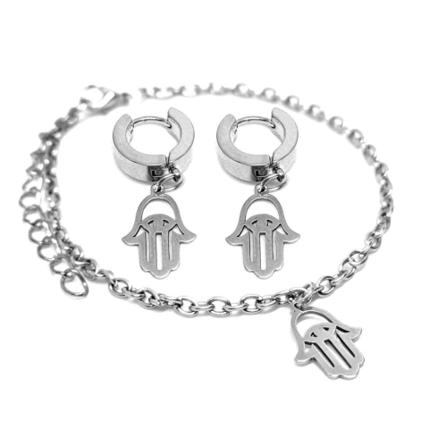 1 kép Nemesacél Fatima keze rozsdamentes acél karkötő + fülbevaló szett, ezüst színű
