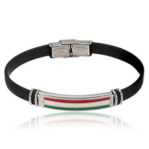 Részletek Olasz nemesacél karkötő kaucsuk szíjjal, magyar színekkel. A nemesacélból készített ékszerek, mint ez a nemesacél karkötő sokkal tartósabbak és ellenállóbbak mint például az ezüst ékszerek. Nem feketednek. További érv az acél ékszerek mellett,