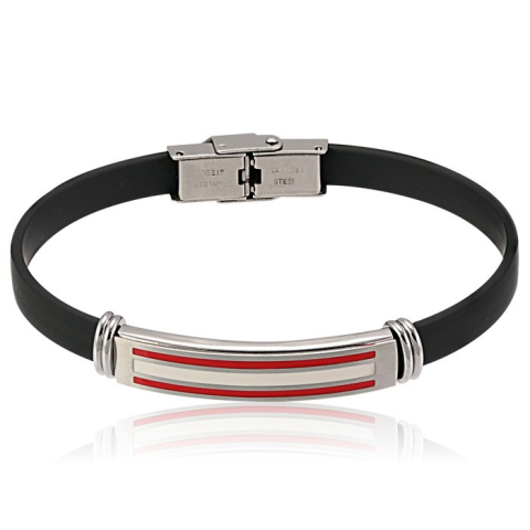 Részletek Olasz nemesacél karkötő kaucsuk szíjjal, piros-fehér színekkel. A nemesacélból készített ékszerek, mint ez a nemesacél karkötő sokkal tartósabbak és ellenállóbbak mint például az ezüst ékszerek. Nem feketednek. További érv az acél ékszerek mel