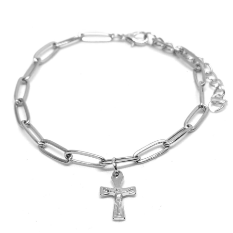 1 kép Nemesacél Kereszt (feszület) díszes hosszú szemes rozsdamentes acél karkötő, ezüst színű