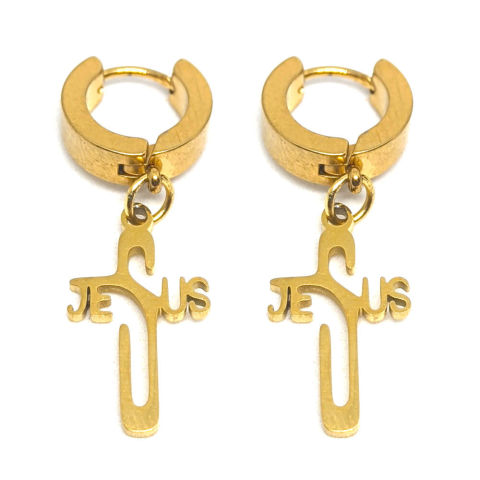 Nemesacél kereszt/Jézus felirat fülbevaló, arany színű