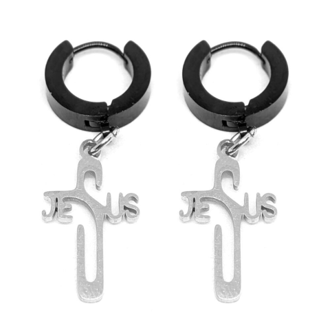 1 kép Nemesacél kereszt/Jézus felirat fülbevaló, ezüst színű, fekete akasztóval