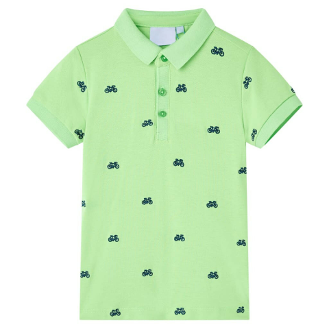 Anyaga: 57% pamut, 38% poliészter és 5% elasztánSzíne: neon zöldDizájn: Kis kerékpárokMérete: 92 (1,5-2 éves korig)Bordás gallér Rövid ujjú Gombos nyak 30°C-ig mosógépben mosható Meleg vasalásra alkalmas