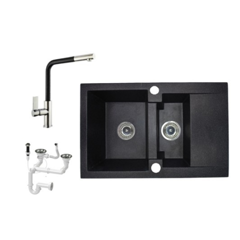 1 kép NERO D737-47C Gránit Mosogató + Kihúzható csap + Dugóemelő (fekete)