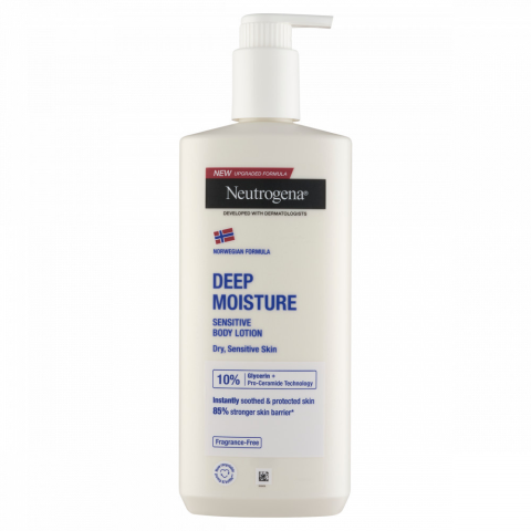 Neutrogena® Norvég Formula® Deep Moisture Sensitive testápoló. Ez az illatanyagmentes testápoló nyugtatja és védi a bőrt. A bőr védőrétege 100+ ceramidból épül fel, hogy megőrizze annak természetes hidratáltságát és egészséges kinézetét. Száraz bőr? Ideje