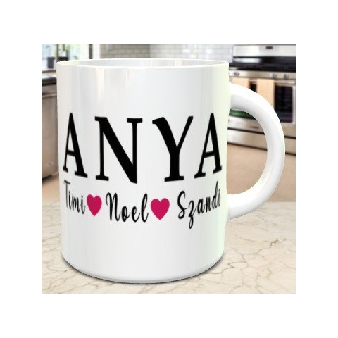 Neves bögre anyáknak, anya gyerekei. Egy szívhez szóló, személyre szabható bögre Édesanyáknak a gyermekei nevével születésnapra, névnapra, anyák napjára. Bögre többféle színű kerámia vagy zománc, tartós minta akár mosogatógépben is tisztítható. Egyedi