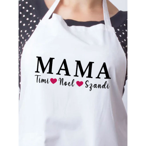 Neves kötény nagymamáknak, mama unokái. Egy szívhez szóló, személyre szabható kötény Nagymamáknak az unokák nevével születésnapra, névnapra, anyák napjára. Fekete vagy fehér kötény mérete 70x79 cm, anyaga vászon. Egyedi mintával ellátott kötényünk prak