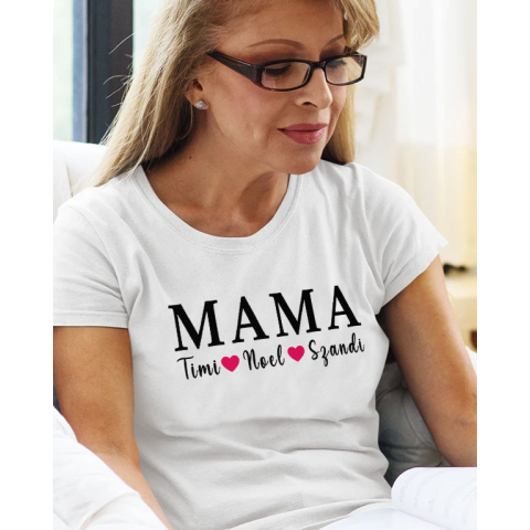 Neves női póló nagymamáknak, mama unokái. Egy szívhez szóló, személyre szabható női póló Nagymamáknak az unokák nevével születésnapra, névnapra, anyák napjára. Karcsúsított fazonú póló többféle méretben és színben. Kiváló minőségű férfi és női pólók,