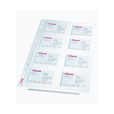 Névjegytartó ESSELTE lefűzhető A/4 8 darabos (16 férőhelyes) 8 részes lefűzhető tasak névjegykártyák számára. Az univerzális lyukasztású lefűzőcsíknak köszönhetően bármilyen iratrendezőben, gyűrűskönyvben használható. 16 névjegykártya tárolásához. Vízt