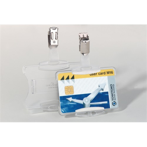 Névkitűző Durable 85x54 mm biztonsági kártyához Méret: 85 × 54 mm Megjegyzés: biztonsági kártyához magas minőségű, polisztirolból készült biztonsági és mágneskártyákhoz álló és fekvő formátumban is használható
