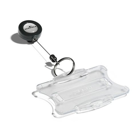 Névkitűző tartó Durable kihúzható, kulcskarikával Kihúzható névkitűzőtartó, kulcskarikával.Ideális kulcsok vagy biztonsági kártyatartók tárolására. Krokodil csipesszel a hátlapon.Hossz: 85 cm