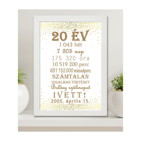 Névre szóló A4 falikép, Boldog szülinapot. Férfiaknak, nőknek és gyerekeknek is egyaránt kiváló választás ez a feliratos A4 méretű falikép. Lepd meg az ünnepeltet egy igazán különleges, személyre szabott ajándékkal! Ez az egyedi falikép mutatja meg, hány
