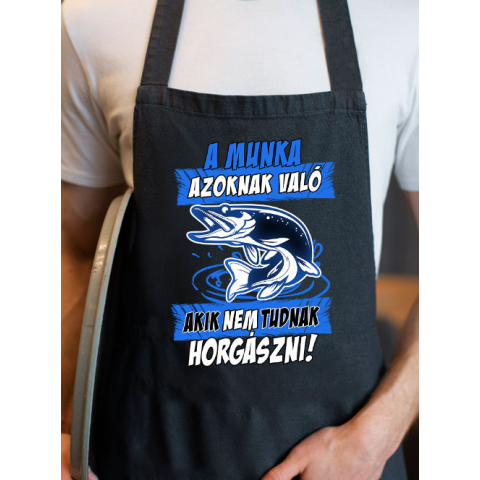 Poénos horgász kötény, munka azoknak való. A munka azoknak való akik nem tudnak horgászni humoros feliratos kötény pecásoknak, kiváló meglepetés minden szorgos horgásznak. Mérete 66x78 cm, anyaga vászon, színe fehér vagy fekete. Egyedi mintával ellátot